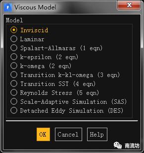 在模型设定面板Models中双击Viscous按钮,弹出Viscous Models对话框,在Model中选择Inviscid,单击OK按钮确认。