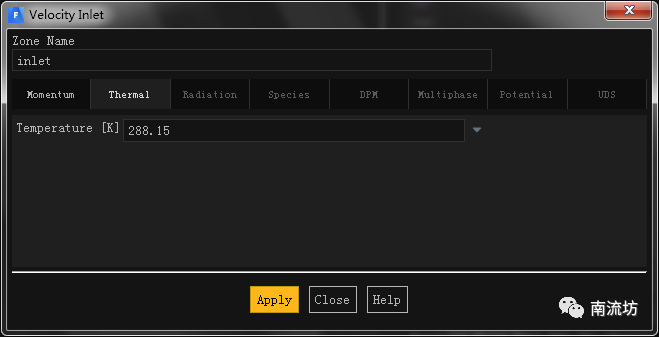 在Thermal选项卡中,Temperature输入288.15,单击OK按钮确认退出。