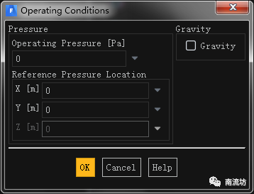 单击主菜单中Physics→Solver→Operating Conditions按钮启动的操作条件对话框。Operating Pressure输入0。