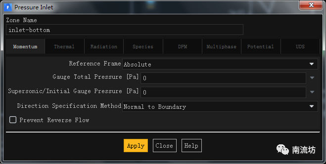 (2)双击inlet-bottom弹出边界条件设置对话框。边界类型为Pressure Inlet,Gauge Total Pressure设置为0,单击OK按钮确认退出。