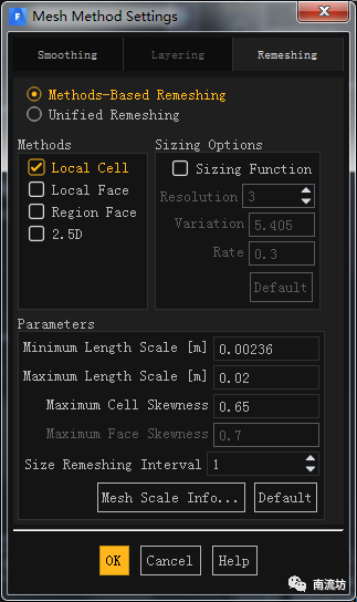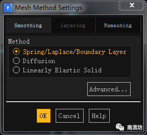 (2)双击Dynamic Mesh按钮,弹出Dynamic Mesh面板,勾选Dynamic Mesh,Mesh Methods中的Smoothing和Remeshing,单击Settings按钮弹出Mesh Method Settings对话框,设置Smoothing和Remeshing参数。
