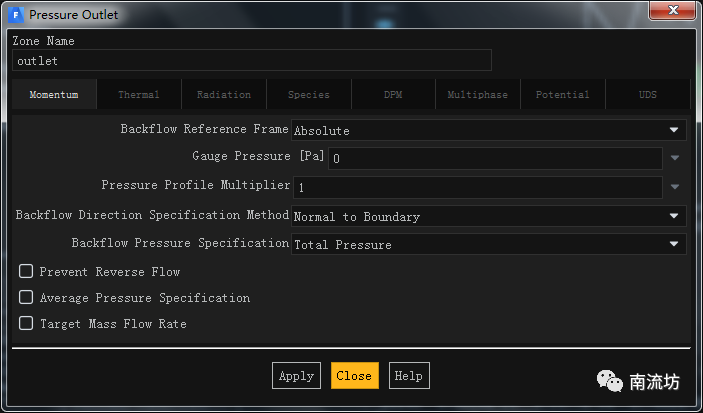 (3)双击outlet弹出边界条件设置对话框。Gauge Pressure输入0,单击Apply按钮确认退出。