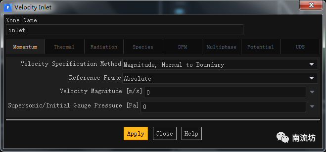 (1)在边界条件面板中,双击inlet弹出边界条件设置对话框。Velocity Magnitude输入0,单击OK按钮确认退出。