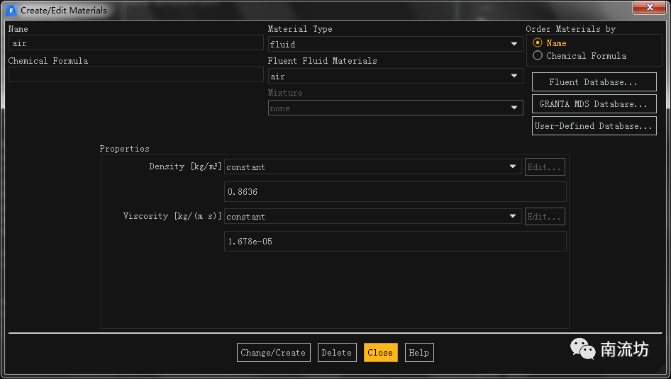 单击主菜单中Setting Up Physics→Materials→Create/Edit,弹出Create/Edit Materials(材料)对话框。设置Density为0.8636,Viscosity为1.678e-05,单击Copy按钮确认。