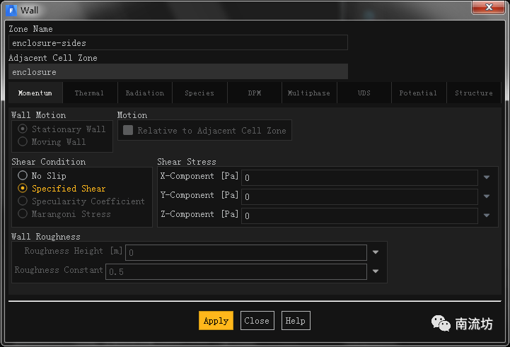(1)在边界条件面板中,双击enclosure-sides弹出边界条件设置对话框。Shear Condition选择为Specified Shear,Shear Stress设置为0,单击Apply按钮确认退出。