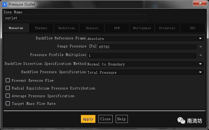(3)双击outlet弹出边界条件设置对话框。Gauge Pressure输入6578,单击Apply按钮确认退出。