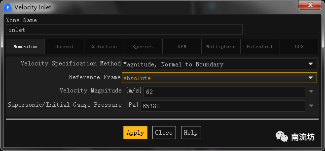 (2)双击inlet弹出边界条件设置对话框。Velocity Magnitude输入62,Supersonic/Initial Pressure设置为65780,单击OK按钮确认退出。