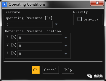 单击主菜单中Physics→Solver→Operating Conditions按钮启动的操作条件对话框,Operating Pressure输入0。