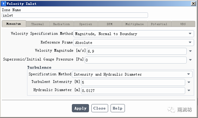 (1)在边界条件面板中,双击inlet弹出边界条件设置对话框。Velocity Magnitude输入6.9。