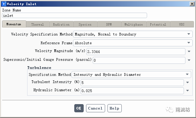 (1)在边界条件面板中,双击inlet弹出边界条件设置对话框。Velocity Magnitude输入2.3344,单击OK按钮确认退出。