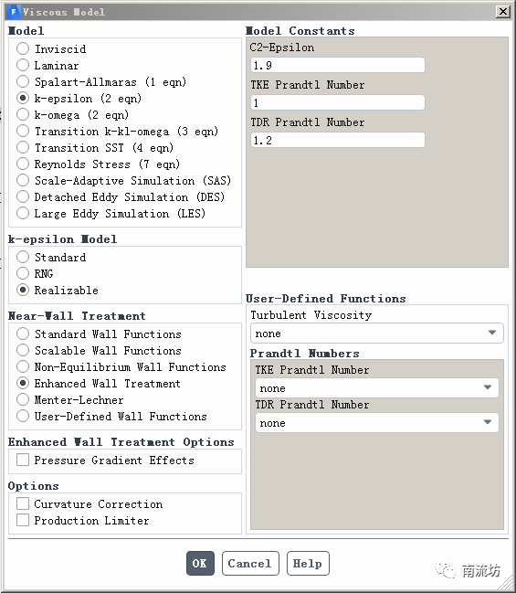 在模型设定面板Models中双击Viscous按钮,弹出Viscous Models对话框,在Model中选择Realizable k-epsilon,Near-Wall Model选择Enhanced Wall Treatment,单击OK按钮确认。