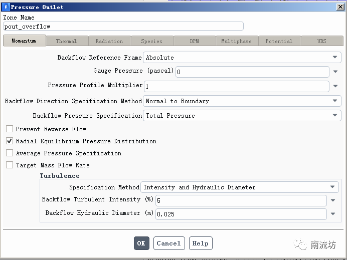 (2)双击pout_overflow弹出边界条件设置对话框。勾选Radial Equilibrium Pressure Distribution,单击OK按钮确认退出。