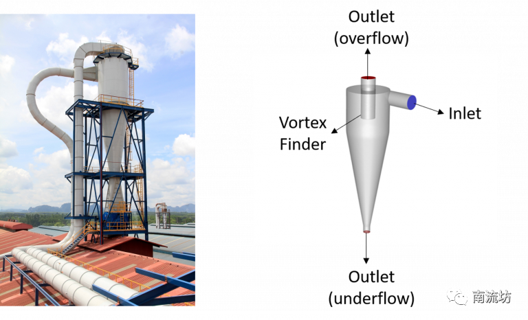 旋流分离是一种广泛应用于流程工业、油气工业和水泥工业的分离技术。旋流分离器内发生的分离机制称为分级,即细颗粒和粗颗粒以及较轻和较重的颗粒根据其在流体中的最终速度进行分离。旋流分离器的工作原理是在初级阶段诱导螺旋旋转,由于离心力的作用,使悬浮颗粒的径向加速度增强。传统的圆柱形旋流装置由一个锥形容器、两个出口(底流和溢流)和一个与圆柱形截面相连的进料口组成,出口均位于对称轴上。底流位于圆锥体的顶端。溢流管是通过旋流分离器顶部的内管。溢流管伸入旋流筒体的部分是一个短的、可移动的部分,称为涡流探测器。涡流探测器防止进料短路直接进入溢流口。
