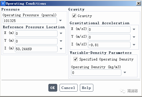 单击主菜单中Physics→Solver→Operating Conditions按钮启动的操作条件对话框。勾选Specified Operating Density,Operating Density输入0。