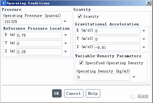 单击主菜单中Physics→Solver→Operating Conditions按钮启动的操作条件对话框。勾选Specified Operating Density,Operating Density输入0。