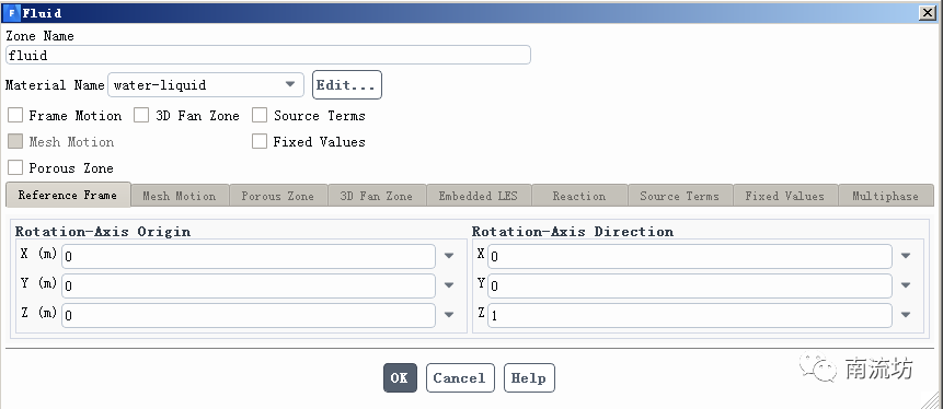 (2)双击fluid弹出计算域设置对话框。Material Name选择为water-liquid。