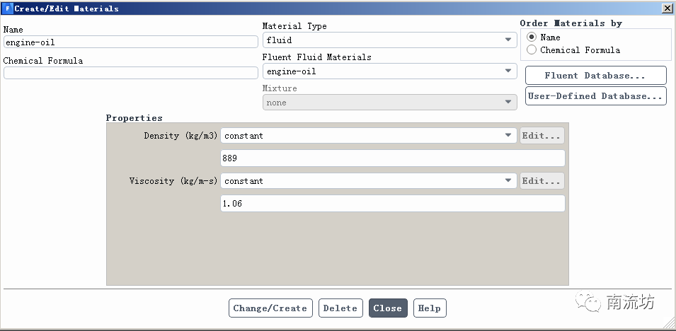 (2)单击主菜单中Setting Up Physics→Materials→Create/Edit,弹出Create/Edit Materials(材料)对话框。单击Fluent Database按钮弹出Fluent Database Materials对话框,选择engine-oil,单击Copy按钮确认。