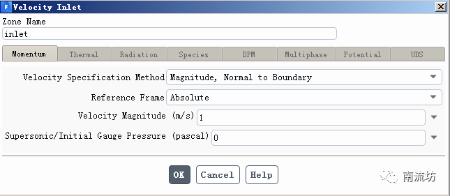 (2)在边界条件面板中,双击inlet弹出边界条件设置对话框。Velocity Magnitude输入1。
