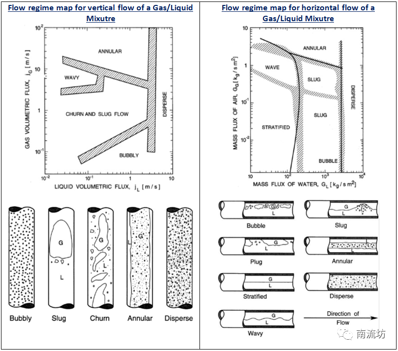 流态图是一种有用的工具,它可以帮助我们对一组特定的输入数据进行概括分析。然而,每个流态图都不足以对其他数据有效,不同的流态图被用来定性的描述不同工况下的流体分布。在垂直或中等偏斜的管道中,气液混合物最常见的流态是气泡流、段塞流、水雾流、搅动流和环状流。在水平管道中,除了在垂直管道中观察到的许多流态外,还可能存在分层或波状分层流。两相流流态通常以曲线或图型的形式表示,在每个轴上都有相速度或它们的函数。早期的流体图是以其作者的名字命名的,例如Griffith-Wallis, Duns-Ros和Taitel-Dukler。下图给出了气体/液体混合物垂直和水平流动的流态图示例。