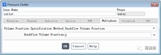 (2)在边界条件面板中,phase选择water,双击设置outlet的边界条件设置对话框。设置Backflow VolumeFraction输入0,单击OK按钮确认退出。