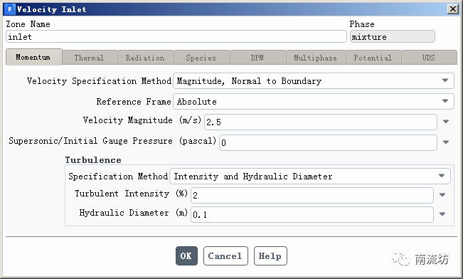 (1)在边界条件面板中,双击inlet弹出边界条件设置对话框。VelocityMagnitude输入2.5,单击OK按钮确认退出。