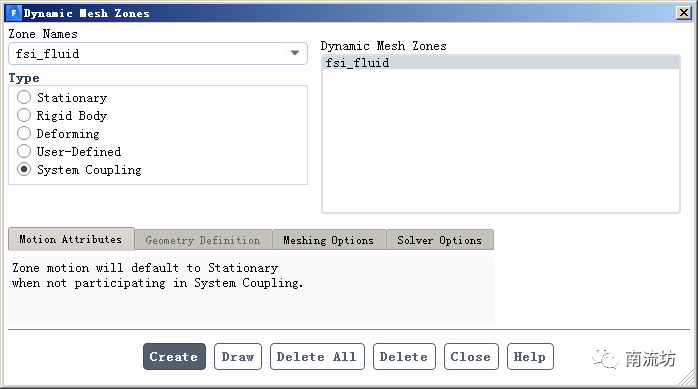 (2)在Zones Names中选择fsi_fluid,Type选择System Coupling,单击Create按钮。