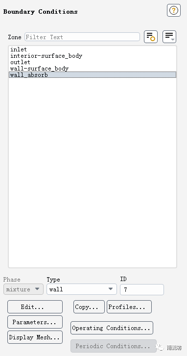 (3)在边界条件面板中,单击选择wall_absorb,读取边界的ID号,即7。