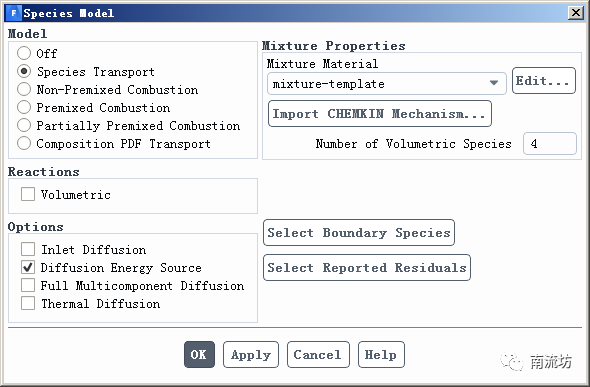 (1)在模型设定面板Models中双击Species按钮,弹出Species Model对话框,选择Species Transport。
