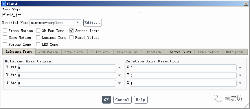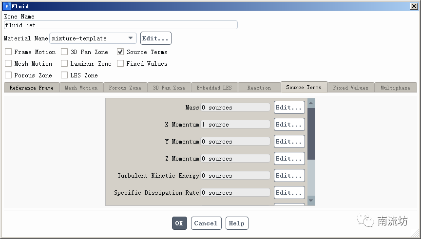 (1)单击主菜单中Setting Up Physics→Zones→Cell Zone Conditions面板。设置fluid_jet,勾选Source Terms。