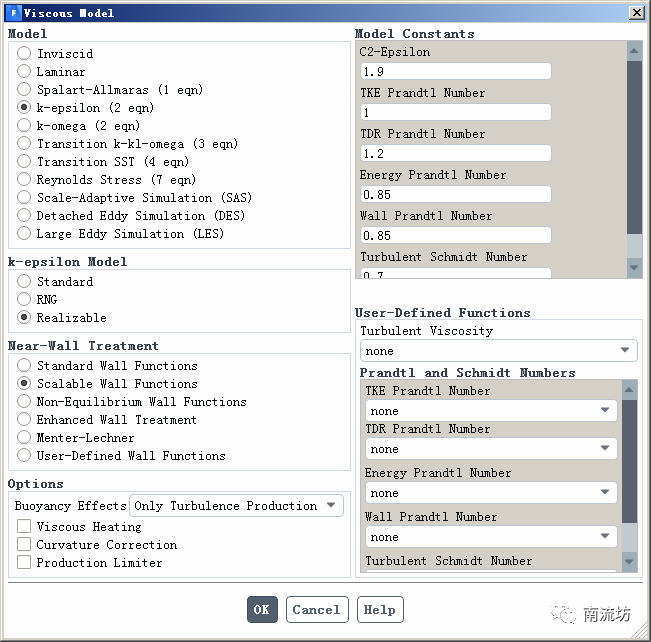 (1)在模型设定面板Models中双击Viscous按钮,弹出Viscous Models对话框,在Model中选择Realizable k-epsilon,单击OK按钮确认。
