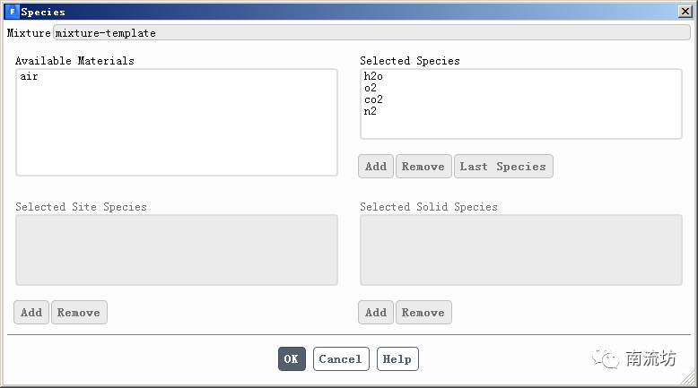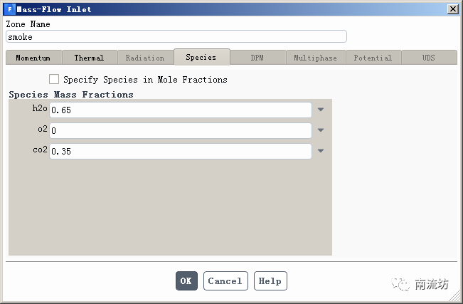在Species选项卡中,h2o输入0.65,co2输入0.35,单击OK按钮确认退出。