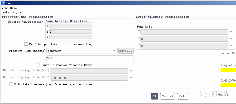 (3)在边界条件面板中,设置internal_fan,边界类型设置为fan。Pressure Jump选择为constant,填入500,单击OK按钮确认退出。