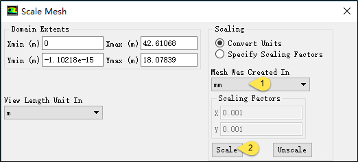 选择Mesh Was Created In下拉框内容为mm,点击Scale按钮进行缩放,缩放后点击close按钮关闭对话框。