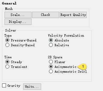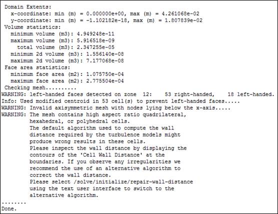 发现警告信息,出现此类警告信息原因在于:案例网格采用2D轴对称网格,而FLUENT对于2D轴对称的要求是对称轴必须为X轴,且网格位于X轴上方。从图2-2可看出Y轴最小值-1.10218e15,位于X轴下方(此微小的值为建模误差所致)。因此需将网格向上平移,平移量无限制,但要确保Y轴最小值大于零。此处将网格向上平移1mm。