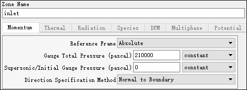 选择右侧设置面板中Zone列表框中的inlet列表项,设置其Type为Pressure-inlet,设置Gauge Total Pressure为2.1e5,点击OK按钮关闭对话框