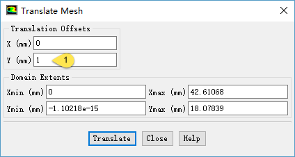 鼠标点击Setting Up Domain标签页下的Transform按钮,选择其中的Rotate按钮,弹出Translate Mesh对话框,设置Traslation Offsets下的Y为1mm