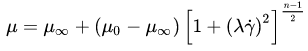 本案例演示如何利用FLUENT求解非牛顿流体流动问题。案例中流动介质粘度采用Carreau模型,该粘度模型表征了流体粘度与剪切率之间的关系。可表示为:
