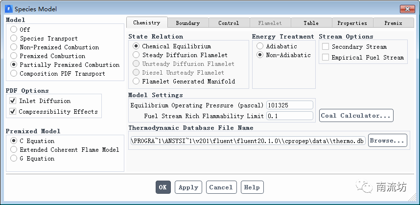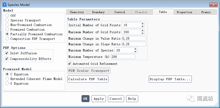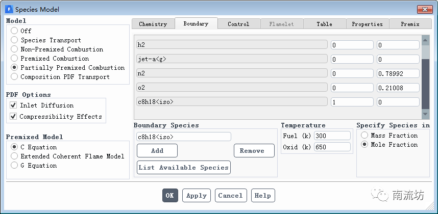 在Model中选择Partially Premixed Combustion,在PDF Options中勾选Inlet Diffusion和Compressibility Effects。