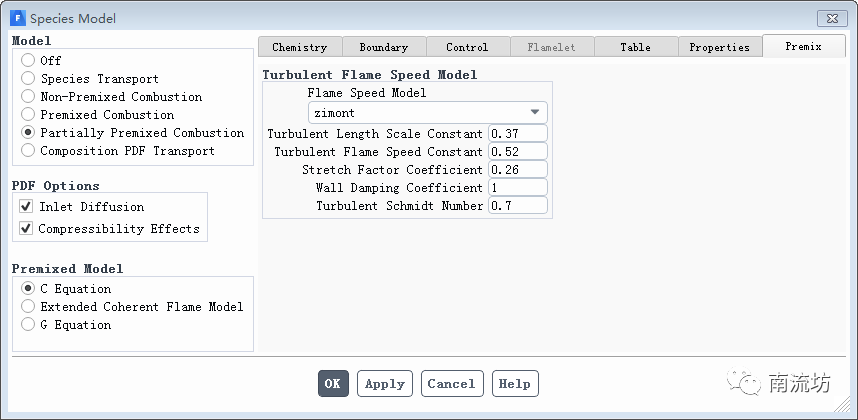 (4)在Premix选项卡中,Flame Speed Model选择zimont。