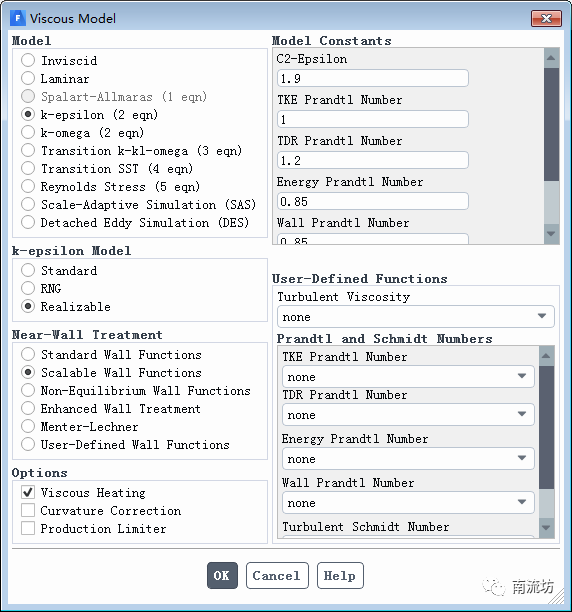 (1)在模型设定面板Models中双击Viscous按钮,弹出Viscous Models对话框,在Model中选择Realizable k-epsilon,单击OK按钮确认。