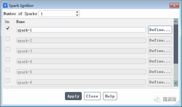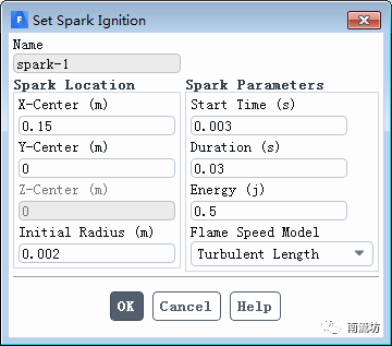 单击主菜单中Physics→Models→Species→Spark Ignition按钮启动的Spark Ignition面板。单击Define按钮设置点火点。