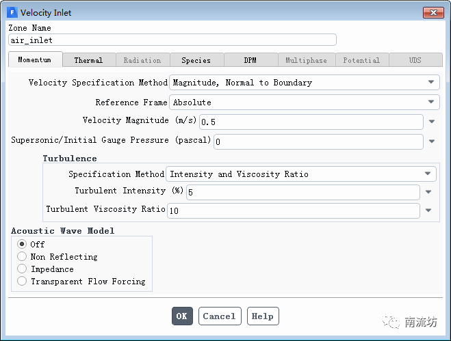 (2)在边界条件面板中,设置air_inlet弹出边界条件设置对话框。Velocity Magnitude填入0.5。在Thermal选项卡中,Temperature输入650,单击OK按钮确认退出。