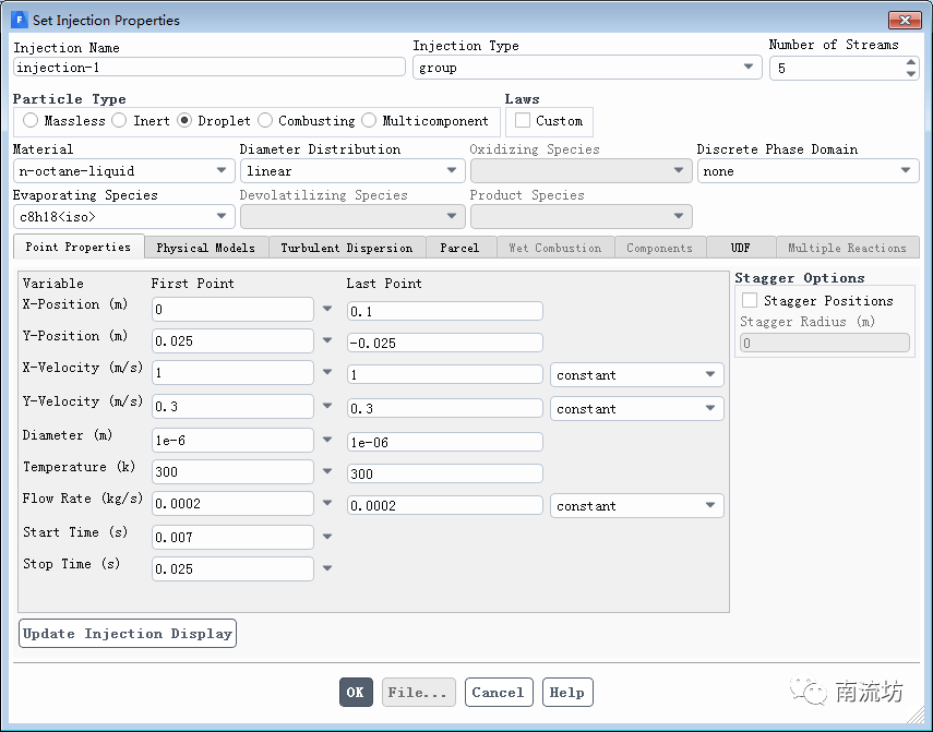 (2)设置injection-0和injection-1。Injection Type为group,Particle Type为Droplet。