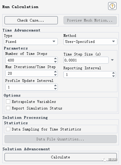 在Time Step Size填入0.0001,Number of Iterations中输入400,单击Calculate开始计算。