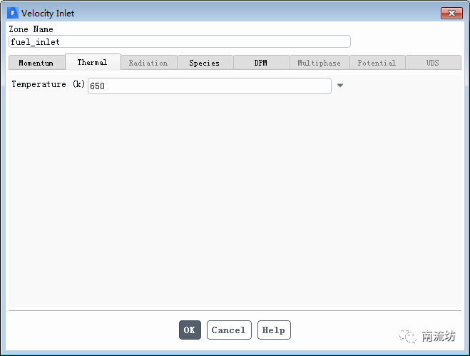 (3)在边界条件面板中,设置fuel_inlet弹出边界条件设置对话框。Velocity Magnitude填入0.2。在Thermal选项卡中,Temperature输入650,单击OK按钮确认退出。