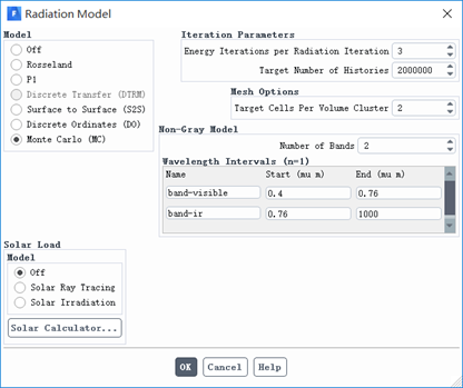 而剩余的热,则作为一个普通的热源添加到LED器件上。这些热以及可见光会加热各个部件,被加热的部件发射出普通的热辐射。因此,在模拟这些问题时,需要使用多个波段来区分可见光和热辐射。例如,在下图中,我们采用了两个波段,一个可见光波段,一个红外波段。不同波段在光学表面上的吸收、发射特性是不一样的。Fluent内置了普朗克分布函数,可以自动调整这种不同。通过上面的这些措施,前述的问题1和2也被解决了。