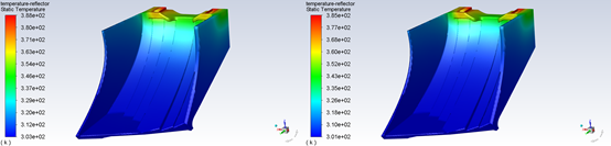 左图是考虑可见光的计算结果;右图没有考虑可见光的影响。很明显,左图中,在LED的正下方,反射碗上的高温区域要更大些。相较于图中所示的反射式LED大灯,对投射式的LED大灯来说,这种影响要更大些
