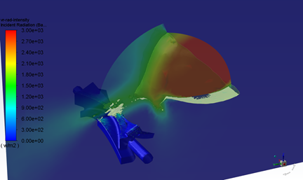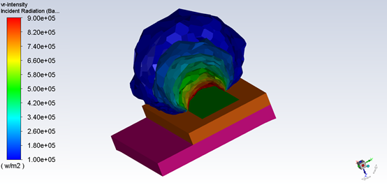 因为这些天然的缺陷,当LED灯具中存在聚焦(以及普通灯具中由于太阳光导致的聚焦现象)时,DO模型几乎给不出有意义的结果。某些软件中使用S2S去解决车灯的热问题,就更加显得不合时宜了。使用Fluent中的蒙特卡洛模型可以克服这些问题。下图给出了使用Fluent分析投射式车灯时的可见光辐射密度分布。可以看到,可见光能量在挡板处聚焦。当然,蒙特卡洛模型也有它的缺陷,那就是计算量较大,但好在Fluent内部提供了一些加速算法来解决这个问题。