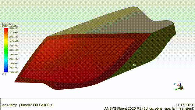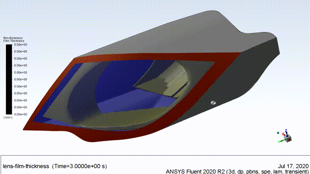 下面动画所展示的是一个测试用的车灯(请诸位不要嫌丑,鄙人不是CAD工程师,这已经是我的呕心沥血之作了),我们使用前述方法进行了除雾模拟(结雾5分钟,除雾10分钟)。可以看到,刚开始结雾时,雾膜迅速生成。其原因主要是试验初始阶段(对应计算的初始条件)车灯被安置在高温高湿环境中,结雾试验开始后,灯罩(配光镜)外部淋雨导致配光镜内表面温度迅速下降,雾膜短时间快速产生。除雾阶段开始后,对比第二幅动画中的温度图,可以看到,也有部分温度稍低的区域(灯罩左侧)除雾较快,其原因则是这些区域空气流通较好,新鲜空气可以快速供给。通过上面简单的描述,读者可以体会到CFD对于车灯除雾设计强有力的指导作用。
