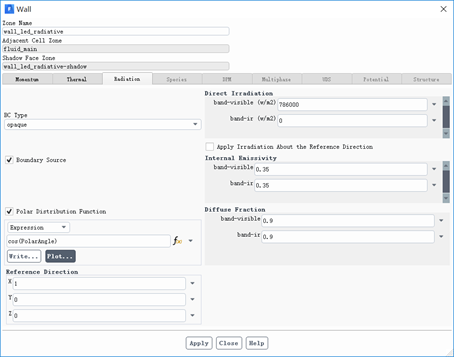 在Fluent的蒙特卡洛模型中,可以在任意一个壁面上以一定的分布给定一个辐射源。由此,我们可以指定LED的发光表面为一个辐射源,让它按照一定的配光曲线,发射出纯粹的可见光,如下图所示。这样,上面提到的第3点就迎刃而解了。